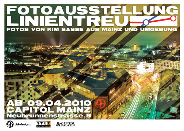 Langsam aber sicher müssen wir dem Foyer im CAPITOL den Status einer Galerie einräumen, denn auch im April wird eine weitere Ausstellung die Wände im CAPITOL zur Blüte treiben. Zu sehen gibt es Fotos aus Mainz und unmittelbarer Umgebung. Schreiend originell, was?! Der besondere Clou an der Sache aber ist, dass die Bilder auf der Ausstellung so aufgebaut sein werden, das man mit einem ausgelegtem „Fahrplan“ durch die Ausstellung laufen kann und dabei quasi einer „Linie“ folgt. Zu jedem Foto wird eine „Haltestelle“ zugeordnet, in dem Plan steht dann ein kleiner Text mit/zu dem Ort und der Fotographie. Nach soviel kontrollierter Rezeption wird dem Gast dank Tinkerman & Friends schließlich die Möglichkeit gegeben, sich der (tanzbaren) Zerstreuung zu widmen!