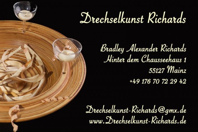 Bradley Richards aus Irland lebt in Mainz und fertigt mit viel Geschick, Freude und Wissen traditionell Handgedrechseltes (wie zum Beispiel Schalen, Löffel, Äpfel, Vasen und einiges mehr) aus zum Teil recyceltem und/oder europäischem Holz. Wichtig ist ihm die Harmonie und der Erhalt des Holzes als eigenes Kunstwerk. Er stellt alltagstaugliche Drechselkunst her und legt sehr viel Wert auf das Finish.