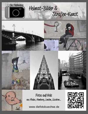 „Die Fotobüchse“ ist ein junges Label aus Mainz und bietet Euch „Foto-Kunst“ zum Hinstellen oder Aufhängen. Hierbei liegt der Schwerpunkt auf urbanen und Streetart-Motiven aus Mainz, Hamburg, London und weiteren europäischen Städten. Die Fotos sind auf Holz „aufgezogen“ und lassen sich an die Wand hängen und/oder auch hinstellen (z.B. auf ein Sideboard). Dieses Jahr sind auch wieder einige neue Motive dazukommen. Also viel Spaß beim Stöbern.