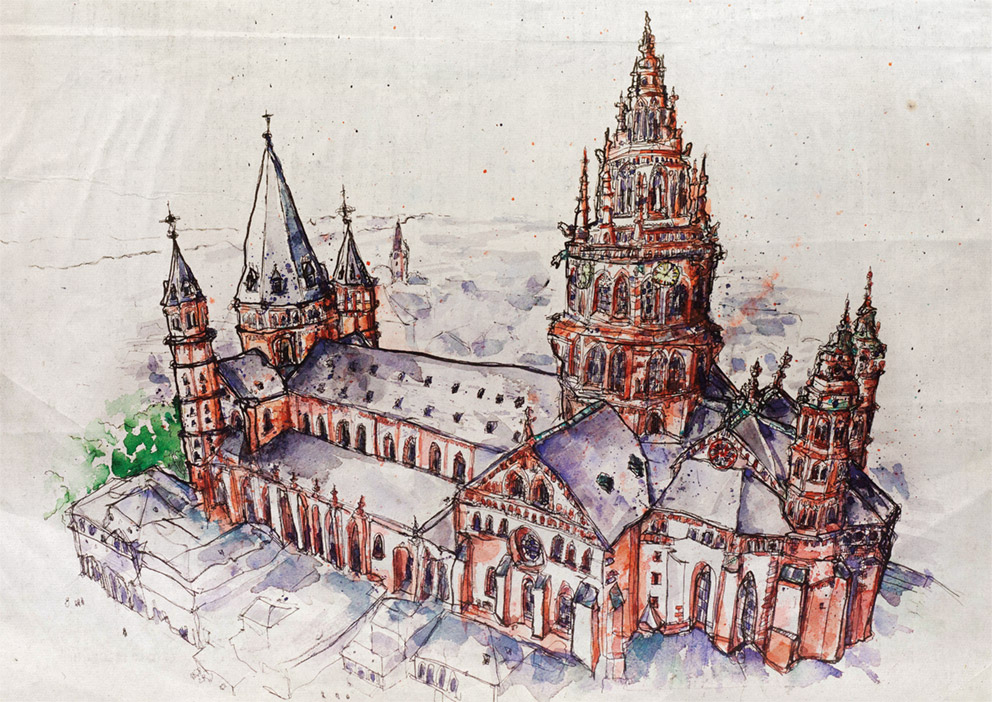 Illustrator und Mediendesigner Marc Zeman nimmt auch dieses Jahr wieder am Weihnachtsmarkt teil. Waren es im letzten Jahr noch Grußkarkten und Porzellan, bietet er dieses mal selbst gestaltete Landkarten der Stadt und Aquarelle mit Mainzer Motiven feil. Großformatiges, allzu Großformatiges, was sich super über dem Sofa macht… // “Anstatt dieses Jahr Geldscheine zu verschenken, bekommt man bei mir auch für das gleiche Geld eine Illustration des Scheins”