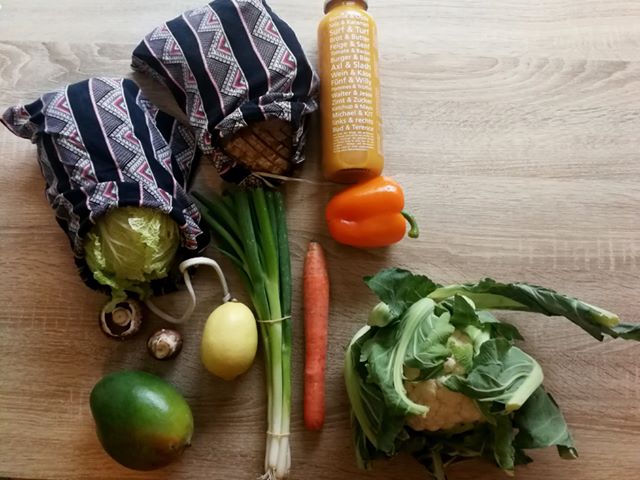 durchmischtes Angebot: Collagen in verschiedenen Formaten, zwischen Postkarten und A3, zu unterschiedlichen Themen // Zudem selbst genähte nachhaltigere Alternativen für Einwegprodukte wie Wattepads und Einkaufstüten etc.