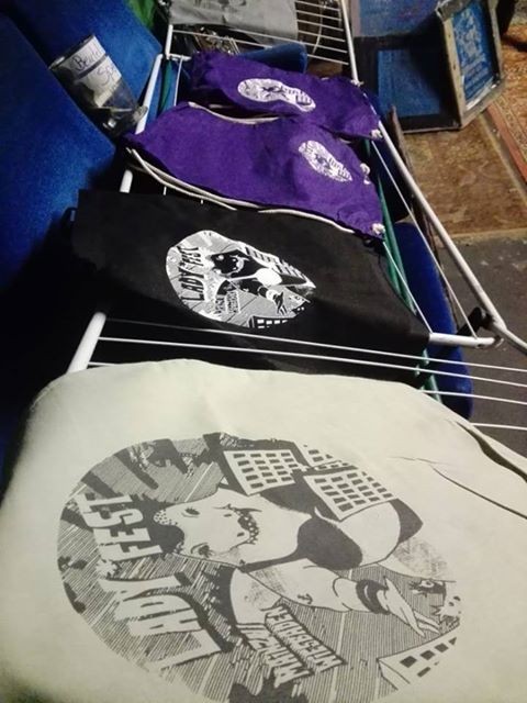 Das Siebdruckkollektiv Oh Rakel macht DIY-Siebdruck und bedruckt vom Demotranspi zur Unterhose alles worauf Siebdruckfarbe haftet. Man kann sich bei Oh Rakel vor Ort etwas bedrucken.