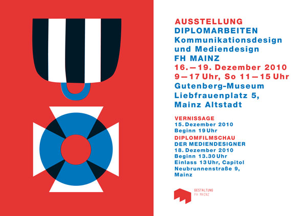 Vom 15. bis 19. Dezember präsentieren 38 Diplomanden der Studiengänge Kommunikations- und Mediendesign der Fachhochschule Mainz ihre Abschlussarbeiten im Gutenberg-Museum. So vielfältig wie die Interessen der jungen Mediendesignerinnen und -designer sind die von ihnen gewählten Darstellungsformen: Bücher, Zeitschriften, Comics, Kommunikationskampagnen, interaktive und Multimedia-Anwendungen und viele experimentelle Arbeiten. Nicht weniger abwechslungsreich sind die Themen, die im Mittelpunkt stehen. Sie umfassen gestalterische, gesellschaftliche, kulturelle, politische und kommerzielle Aspekte.