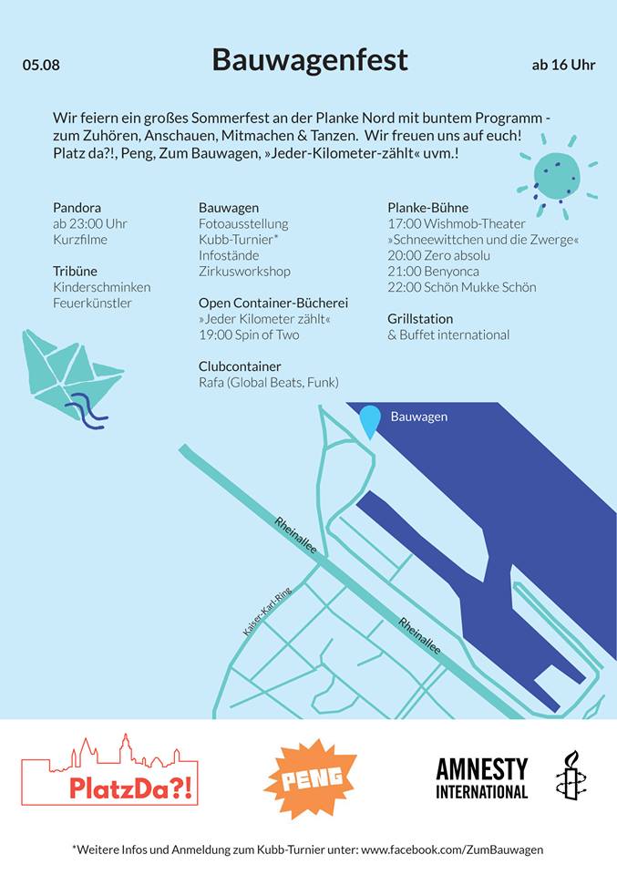 Wir feiern ein großes Sommerfest mit buntem Programm für Groß und Klein! Wir!? Wir sind der Bauwagen, der Pandora-Container, ‘Jeder-Kilometer-zählt’, Platzda?!, das Wishmobtheater und und und. Ein großes Miteinander! Sei dabei!