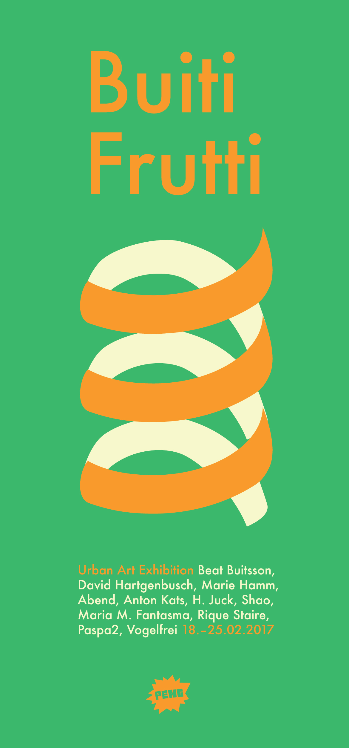 Elf Künstlerinnen und Künstler aus verschiedenen Städten Deutschlands haben sich für diese Ausstellung zusammengeschlossen. Buiti Fruiti eröffnet die Möglichkeit Kunstwerke erlebbar zu machen, deren Ursprünge sich in den verborgenen Bereichen des urbanen Lebensfeldes verorten lassen. Die Ausstellung versteht sich als eine Einladung an die Besucherinnen und Besucher, urbanen Kunstformen auf die Spur zu kommen und möglicherweise überraschende Einsichten und Begegnungen mit den Potenzialen und Interessen der Künstlerinnen und Künstler zu machen.