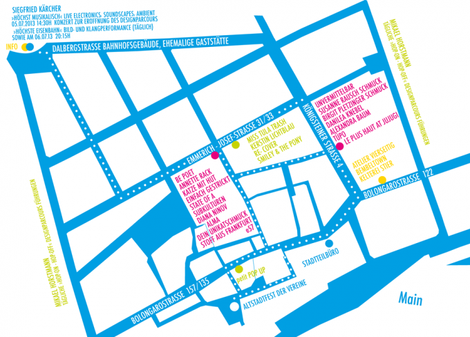 Der Höchster Designparcours wird 2013 zum Altstadtfest der Vereine von Freitag 05. – Sonntag 07.07.2013 jeweils von 12 – 20 Uhr in mehreren leerstehenden Ladenflächen in der Kernstadt von Frankfurt-Höchst stattfinden.