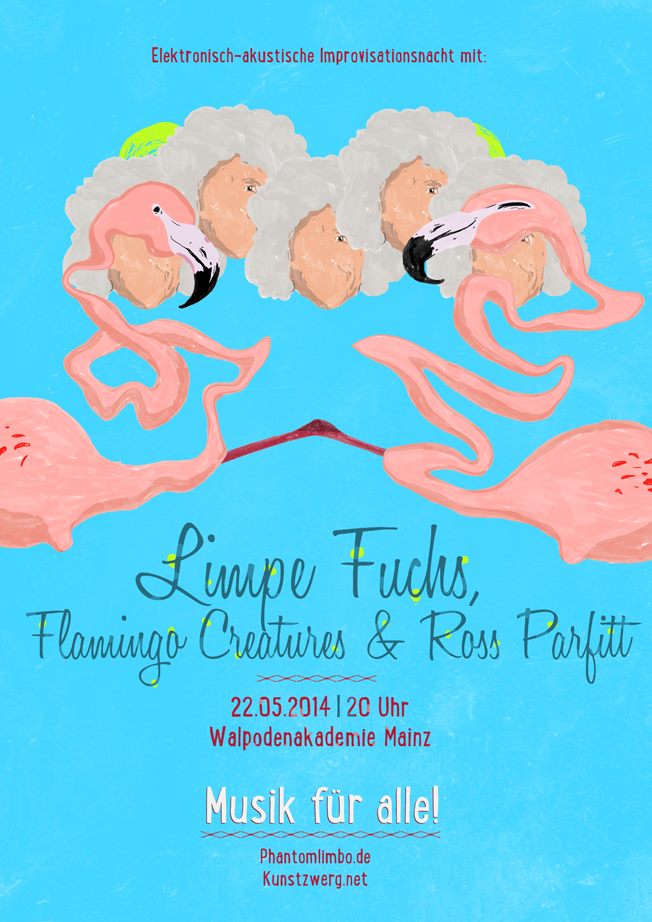 Limpe Fuchs, die Grande Dame der freien Improvisation zusammen mit den Flamingo Creatures. Die Frau, die bereits 1970 nackt und schwarz angemalt den Bundesbürgerinnen und Bürgern den Marsch blies, steht seit dem “Stürmischen Wochenende” im November 2011 im musikalischen Dialog mit dem experimentell-psychedelischen Duo.