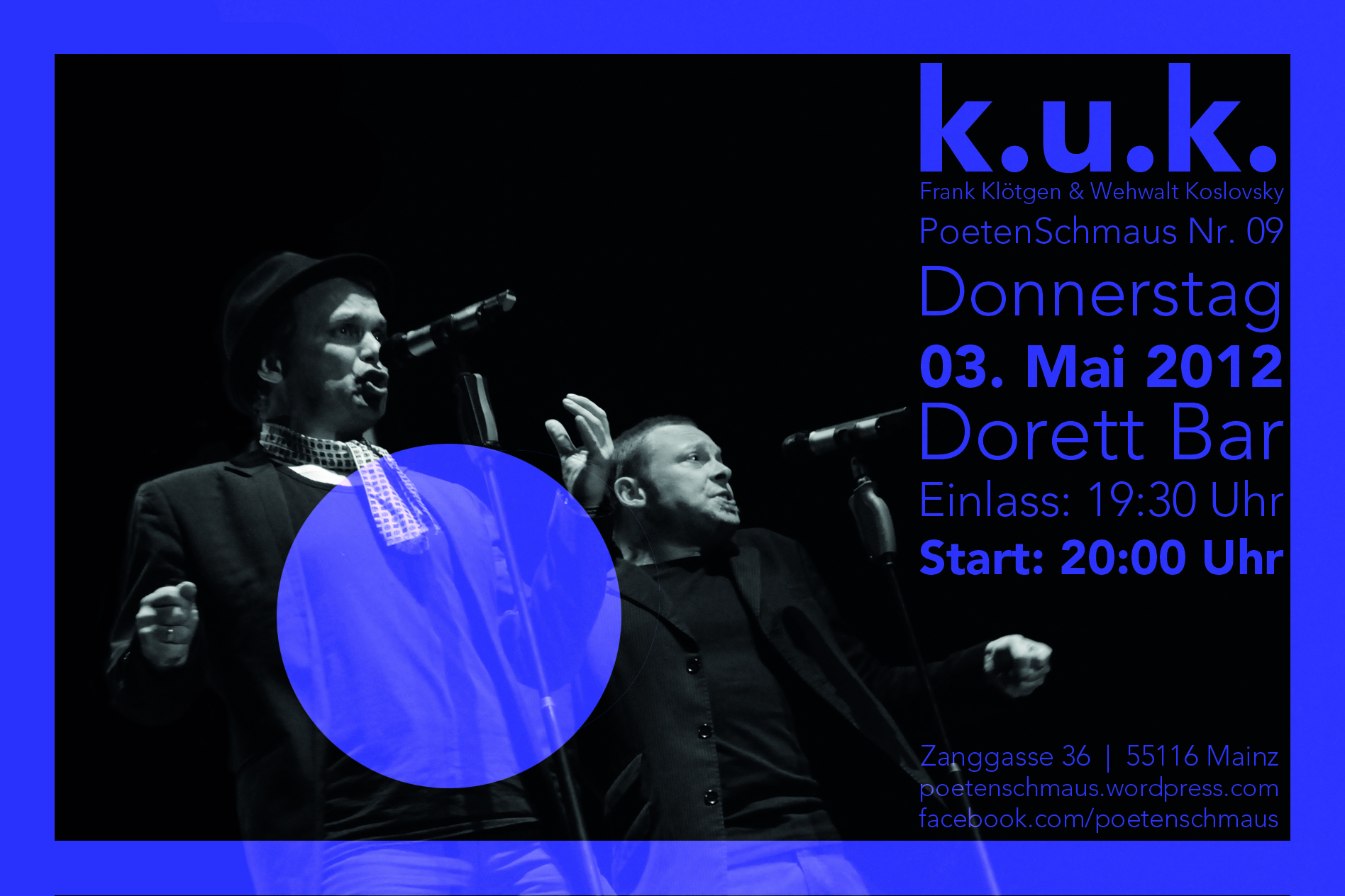 k.u.k. – das sind Wehwalt Koslovsky und Frank Klötgen im Doppel auf Tour. Die zwei Poetry Slammer aus Berlin produzieren einen atemberaubenden Spoken Word Sturm auf Versmaß. Von bitterbösen Balladen bis zum Dada-Stabreim, von skurrilen Oden bis hin zu kantiger Liebeslyrik. Performance Poetry, die rund 2.000 Auftritte in ganz Europa geschultert hat – im Duett auf der Bühne. Ein wortgewaltiges Plädoyer für den Reim. Gewinner des Polit-Slams der Süddeutschen Zeitung und dritter Sieger im Team-Wettbewerb der deutschsprachigen Poetry Slam-Meisterschaften 2009. Und höchst unterhaltsam.