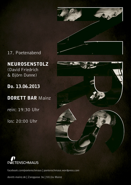 MEHR INFOS: PoetenSchmaus ist eine seit 2011 existierende monatliche Veranstaltungsreihe in der Dorett Bar. Der Poetenabend ist kein Wettbewerb, kein Poetry Slam, keine Lesebühne, sondern ein Abend mit einem Spoken Word Poeten, Wortkünstler, Lyriker oder Liedermacher, der Abendfüllendes Programm zu bieten hat – Spoken Word auf der Bühne, Lesung, Bühnenliteratur und/oder Musik.