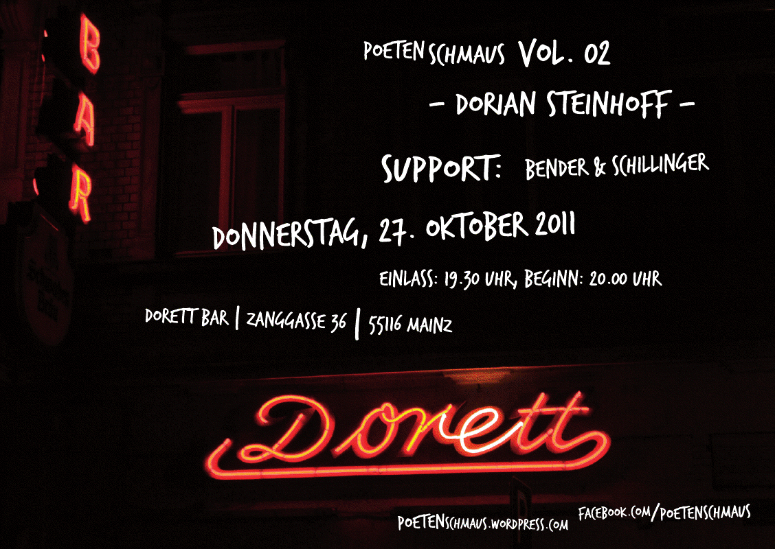 Dorian Steinhoff ist Autor, Literaturveranstalter, Dozent und Journalist. Er wurde 1985 in Bonn geboren und studierte Philosophie, Rechtswissenschaften und Germanistik an der Uni Trier. Seit März 2007 reist er überall dorthin, wo die Menschen seine Sprache sprechen und seine Texte hören möchten. Er liest ihnen dann vor und macht das schön und gut. Im April 2009 erschien eine erste Sammlung seiner Erzählungen und Bühnentexte unter dem Titel ‘Goldfische sind auch keine Lösung’ beim Lektora Verlag.